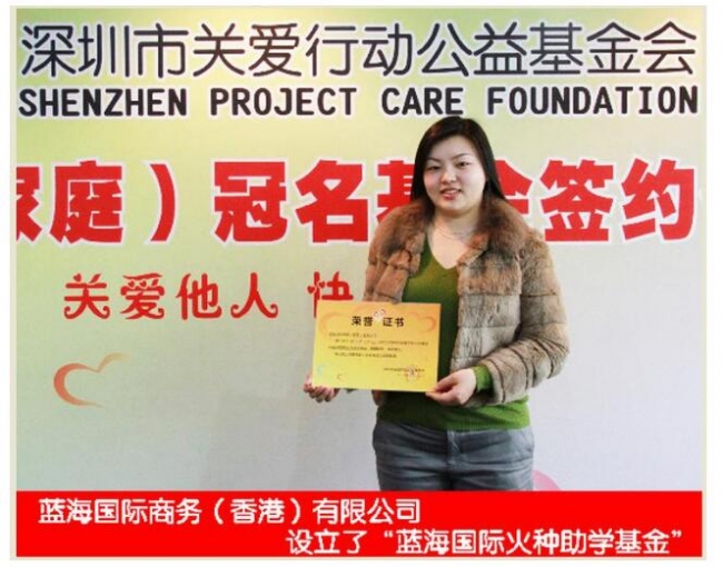2014年01月10日,劉光容女士用她的其中一個(gè)公司【藍(lán)海國(guó)際商務(wù)(香港)有限公司】名義,在深圳市關(guān)愛行動(dòng)公益基金會(huì)成立了設(shè)立了“藍(lán)海國(guó)際火種助學(xué)基金”。