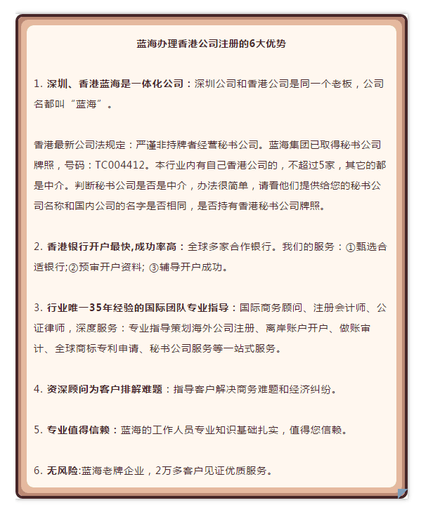 所以,選擇具有深港一體化專業(yè)的秘書公司,這一點(diǎn)很重要,這決定了后續(xù)服務(wù)的質(zhì)量。,千萬(wàn)不要因?yàn)?/font>省幾百甚至幾十元的費(fèi)用而因小失大!擦亮眼睛才是關(guān)鍵!